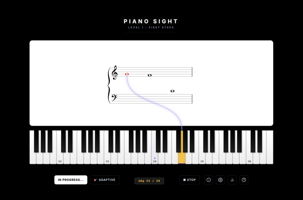 - Recall (The reflex): The notation disappears or changes. You must recreate the pattern instantly on the virtual piano (or your real MIDI keyboard).